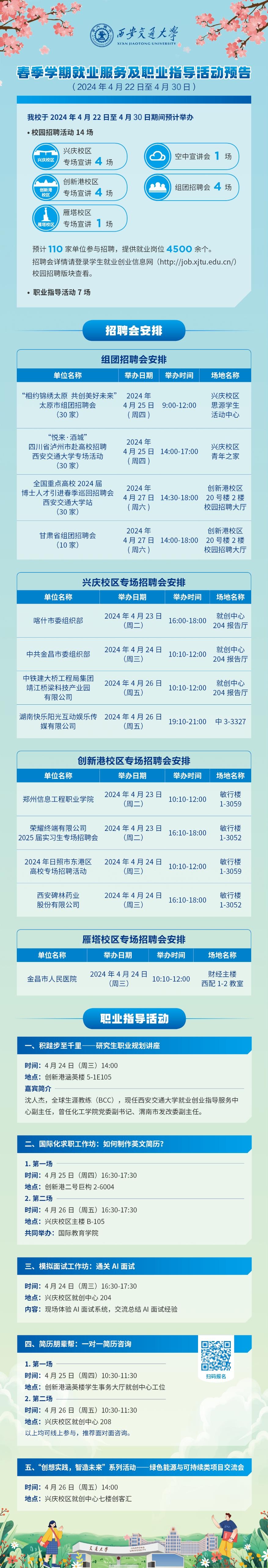 西安交通大学春季学期就业服务及职业指导活动预告(2024年4月22日至4月30日)