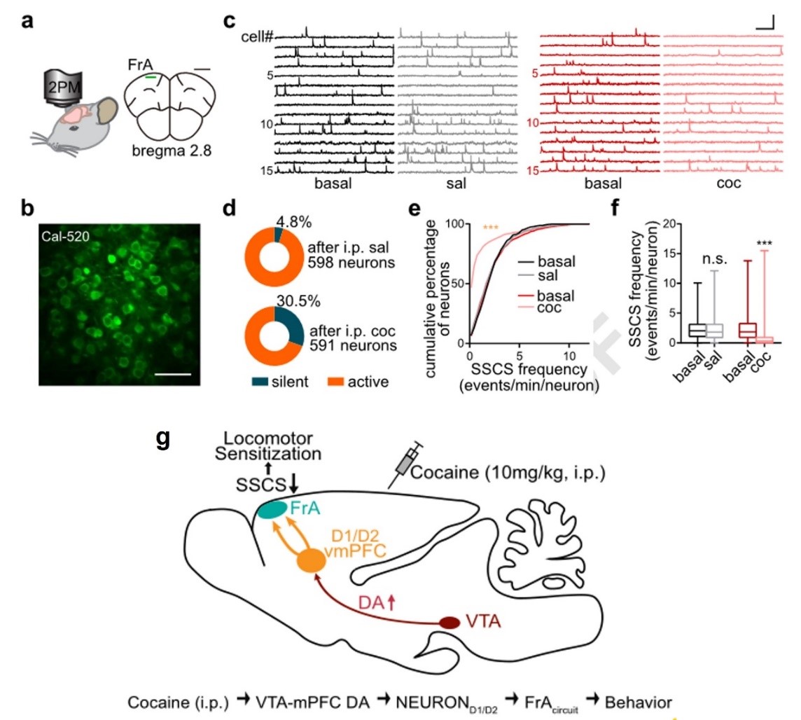 生命学院王昌河课题组联合北京大学未来技术学院周专团队开展研究,该研究联合使用两项高难度清醒动物生理记录技术:双光子对小鼠大脑PFC深层神经元网络Ca2+成像和peg-CFE记录PFC的DA分泌信号,实时记录FrA神经网络中的神经元群活动(同时长时程记录~50个神经元),发现急性可卡因注射抑制了FrA 第II/III层兴奋性神经元的兴奋性。通过化学遗传学直接操控这类神经元的兴奋性能调控可卡因诱导的运动敏化行为。借助病毒工具、离体脑片电生理、活体小鼠电化学、双光子成像、药物颅内注射等一系列手段,创新性地鉴定了一条参与调控可卡因敏化行为的新环路:腹内侧前额叶皮层-额叶联结皮层(vmPFC-FrA)。进一步,发现可卡因对 FrA 神经元活动的抑制作用依赖于vmPFC脑区的多巴胺转运体(DAT),即可卡因通过阻断vmPFC区域多巴胺神经末梢上的DAT,增加局部多巴胺的浓度,从而激活或抑制D1 和 D2受体阳性vmPFC神经元,vmPFC 神经元进而调控其下游FrA 神经元活动和可卡因敏化行为。该研究为可卡因的敏化行揭示了PFC亚区域之间的环路新机制,新的成瘾机制理论将为可卡因等成瘾性药物的戒断提供重要理论依据和方向。该研究首次发现内侧前额叶皮层(medial prefrontal cortex, mPFC)—额叶联结皮层(Frontal associationcortex, FrA)之间的新神经投射环路,并揭示该环路(vmPFC-FrA)在可卡因敏化行为调控的中的核心作用与作用机制。