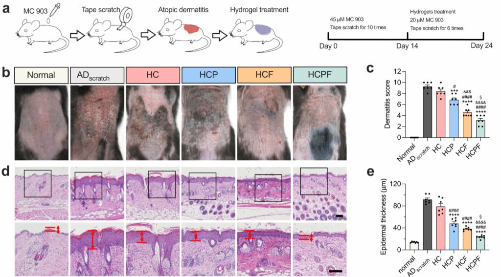 针对上述问题,西安交通大学生命科学院与技术学院仿生工程与生物力学研究所(BEBC)以交大“大医科+强工科”模式为载体,充分利用多学科交叉和理工医融合的优势,与西安交通大学第二附属医院皮肤科耿松梅教授团队合作,基于力学、材料学、皮肤病学等多学科交叉,开发了一种多功能水凝胶皮肤敷料,首次实现了力-化协同治疗特应性皮炎。