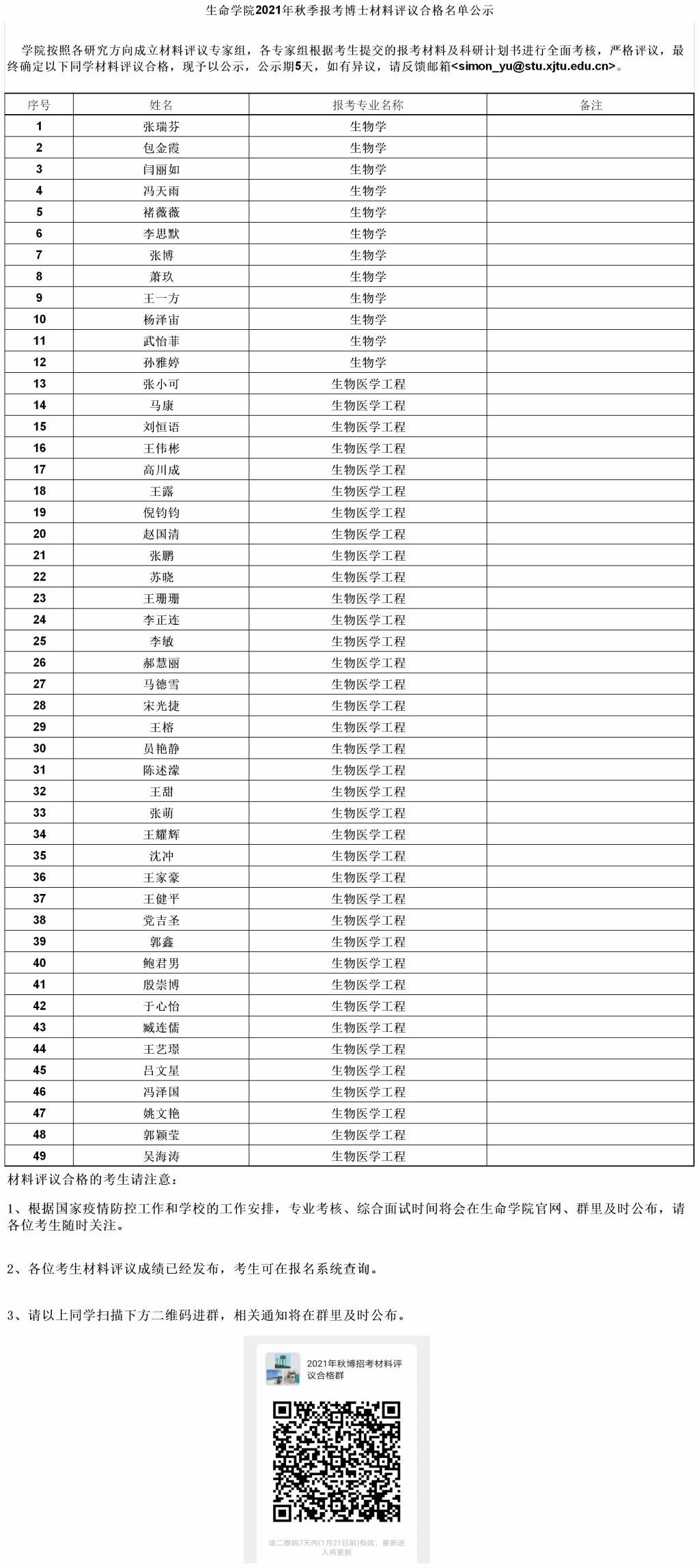 生命学院2021年秋季报考博士材料评议合格名单公示