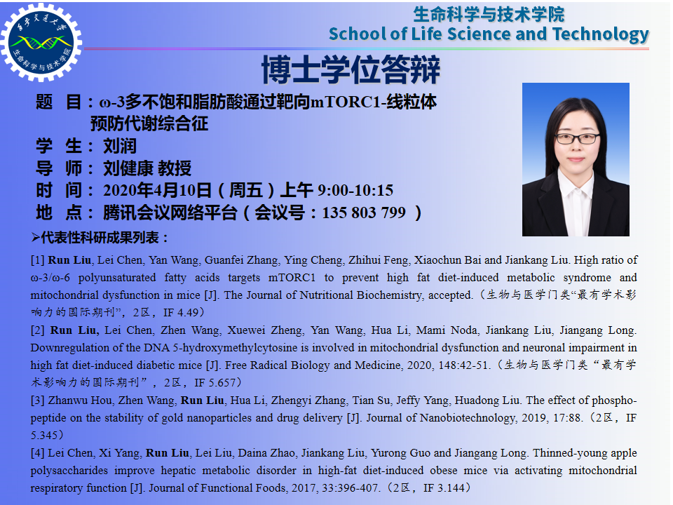 [1]Run Liu, Lei Chen, Yan Wang,GuanfeiZhang, Ying Cheng,ZhihuiFeng,XiaochunBai andJiankangLiu. High ratio of ω-3/ω-6 polyunsaturated fatty acids targets mTORC1 to prevent high fat diet-induced metabolic syndrome and mitochondrial dysfunction in mice [J]. The Journal of Nutritional Biochemistry, accepted.(生物与医学门类“最有学术影响力的国际期刊”,2区,IF 4.49)