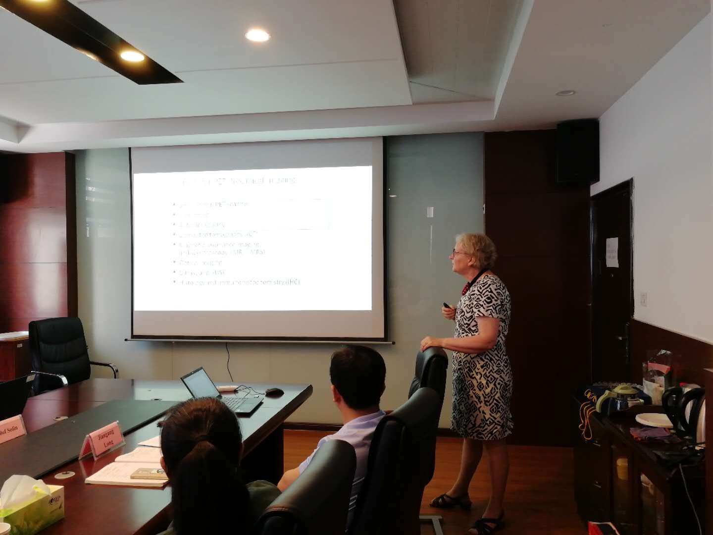 OlofSolin教授在此次报告中向大家简要介绍了芬兰国家PET中心,该中心主要分布在Turku大学,由加速器实验室,放射性药物化学实验室及临床成像实验室组成,OlofSolin教授主要负责放射性药物化学实验室的运作。在报告中,OlofSolin教授给师生们分享了一些典型的案例,包括现阶段开发中的11C-,13N-,15O-,68Ga-,18F-标记的疾病标志物前体在科研及临床研究中的应用,开发合成高比放射性的PET放射性示踪剂的方法,以及用于人体健康和疾病研究的PET放射性示踪剂的研究。MerjaHaaparantaSolin教授介绍了应用于小动物PET成像的示踪剂的特点,以及示踪剂在小动物及各种小动物病理模型中成像的应用。