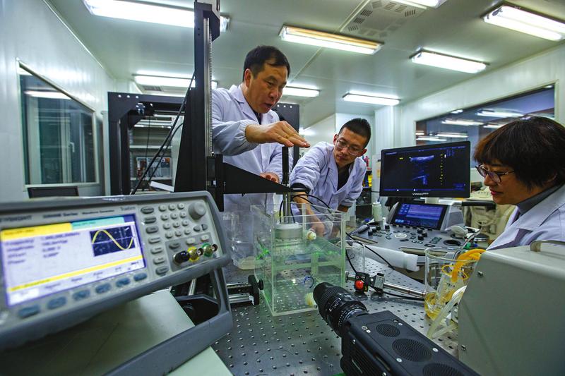 1月15日,由万明习教授(左一)带领的西安交通大学生物医学超声团队在进行超声微泡造影成像实验。万明习教授研究团队成功研制了我国超声微泡造影成像首套实验系统和首台原型样机。该设备可用于肿瘤、心血管疾病检测以及早期小肿瘤定性分级检测与边界确定,并成功入选“2017中国十大医学进展”。