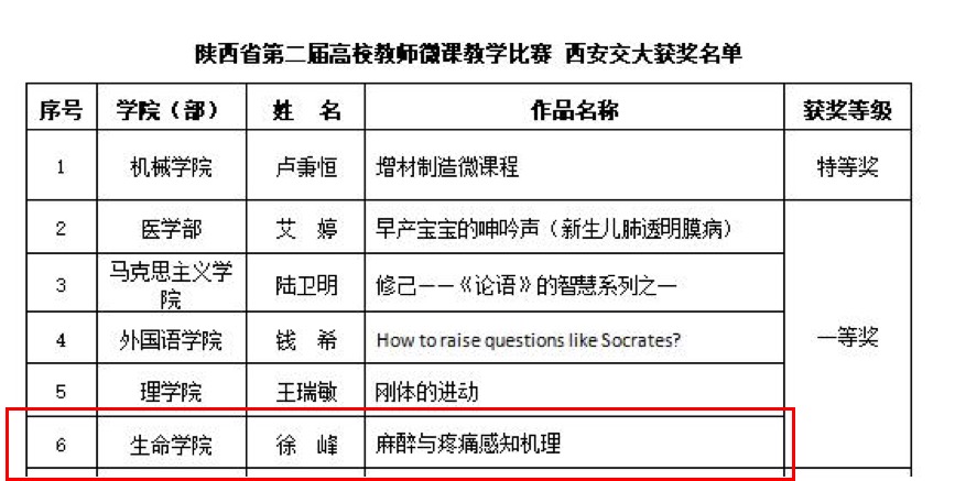 近日,陕西省第二届高校教师微课教学比赛结果揭晓,我院徐峰教授的《麻醉与疼痛感知机理》微课荣获此次比赛一等奖。