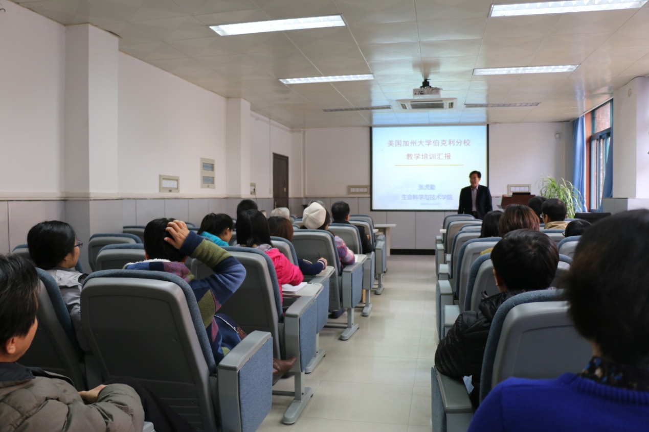 2016年11月23日下午,生命学院举办“美国加州大学伯克利分校教学培训”汇报会,督导专家朱继洲教授、教师教学发展中心马知恩主任、中国西部高等教育评估中心陆根书主任和李宏荣副主任等出席报告。生命学院青年老师、新讲师、部分博士和硕士研究生以及人居学院老师参加了报告会。由张虎勤教授报告了这次教师教学发展中心组织的加州大学伯克利分校教学培训的主要内容。