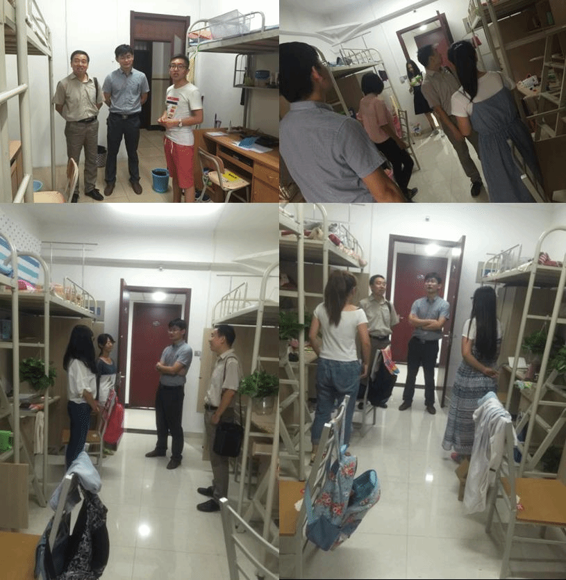 2016年9月9日下午,生命学院分党委副书记龙跃、院长助理杨铁林教授与新生辅导员刘腾一同前往研究生新生宿舍进行走访慰问。学院共有新生宿舍24间,其中女生新生宿舍主要集中在西-3和七彩阁西-22,男生新生宿舍主要集中在西-10和西-11。学院领导老师一行依次走访了每一间新生宿舍,与每一位学生亲切交谈,详细询问学生个人情况,包括学生生源地、报考导师、研究方向等。龙跃书记重点询查了女生住宿的情况,同时传达了学校对新生的关怀和相关政策。杨铁林教授更是向新生们讲述了学院的科研概况,与新生们亲切地交谈着他们各自的研究方向,并对研究生的学习和生活给出了中肯的建议。整个过程中,新生们感谢学院领导给予的家人般的关爱,并表示自己对住宿环境满意、对学院有了更强的归属感、对自己的研究生生涯有了更坚定的信念。