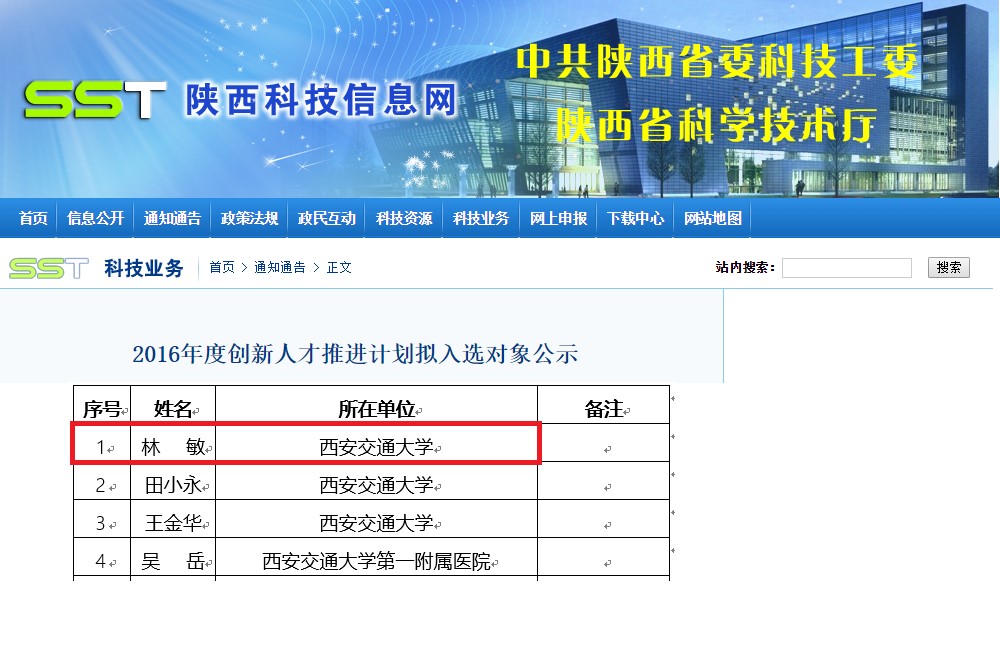近日,陕西省科技厅公示了2016年陕西省创新人才推进计划拟入选对象,我院青年教师林敏副教授荣获“青年科技新星”表彰。