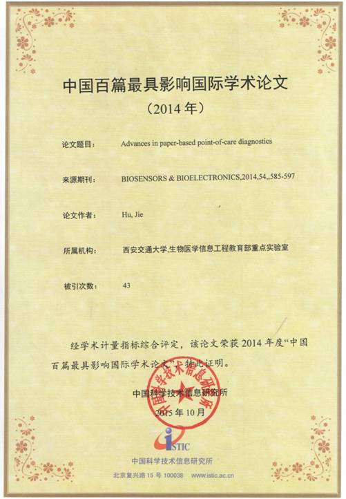 在卢天健教授和徐峰教授的指导下,胡杰同学一直围绕着即时检测这一领域开展研究,先后与我校能动学院、电信学院,香港科技大学,马来亚大学,哈佛大学等师生开展合作,至今已发表学术论文13篇(其中SCI检索10篇,国内核心期刊3篇);此外,还有8篇论文正在审稿当中,其中包括一篇受生物科技领域权威期刊Biotechnology Advances约稿所撰写的关于即时诊断技术的研究综述。参加国内外学术会议11次,申请国家发明专利4项(其中1项已获授权),获得校级创业大赛金奖1项。胡杰同学已获得2014年度博士研究生国家奖学金,“优秀博士毕业生”称号;受我校研究生短期出国访学资助,目前还在圣路易斯华盛顿大学交流学习。
