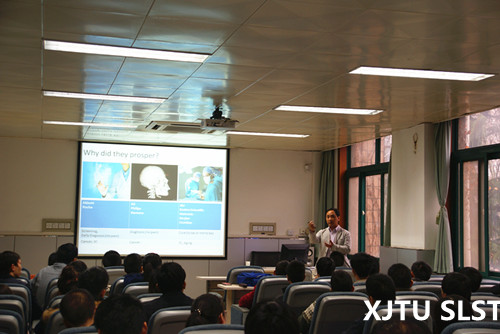 张崧先生曾任深圳迈瑞生物医疗电子股份有限公司外科与新兴事业部总经理和迈瑞集团常务副总裁,也曾就职于美国Silicon Optix公司和加拿大Vasogen公司。他从丰富的阅历中提取出人们所重视的、引导生物医药企业发展的三大要点,分别是死亡、病痛和老龄化,基于这些要点分析了国内外主要生物医药企业的经营重点,就其发展前景进行了阐述。与此同时,张崧先生也将华为技术有限公司作为一个正面例子进行分析,对其抓住机会利用以“硅”为代表的半导体材料与国际企业站在同一起跑线上竞争并取得今日佳绩的征程颇为赞赏,并鼓励同学们发现自己的“硅”,在未来的就业过程中可以提高竞争力,利于个人发展。