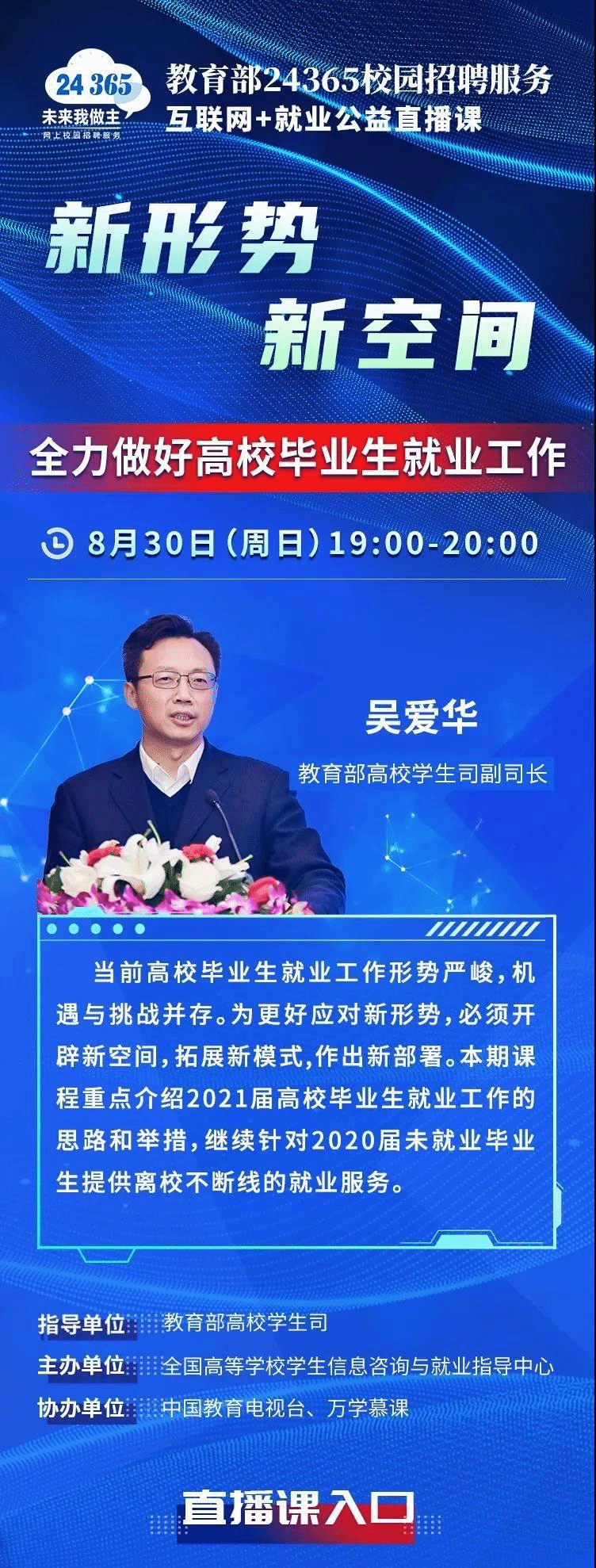 教育部互联网+就业公益课程(第21期)8月30日(周日)19:00-20:00播出,教育部高校学生司副司长吴爱华同志作主题报告,重点介绍2021届高校毕业生就业工作的思路和举措,课程结束后举办专场答疑活动。