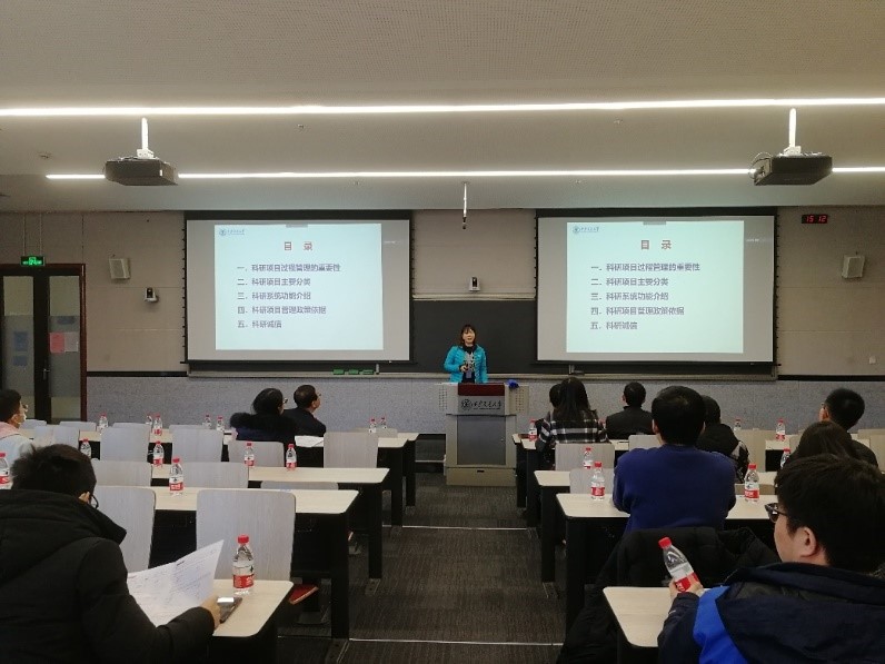 王庆琳向参会人员做了《加强过程管理 提高服务效能》报告,报告从科研项目的分类着手分别解读了纵向项目、横向项目、校级项目三种不同项目类型的财务管理规定,同时介绍了新开发的科研管理信息系统中经费相关模块的内容。