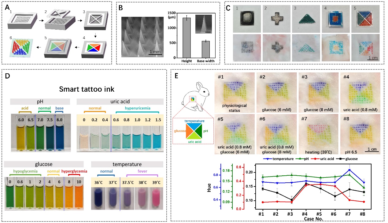 图1.智能纹身在健康管理中的应用。(A)用于智能纹身的水凝胶微针贴片的制备过程。(B)微针贴片的形貌和尺寸表征。(C)微针贴片制备的智能纹身。(D)用于监测健康相关指标的智能纹身墨水。(E)智能纹身同时监测多种健康相关指标。