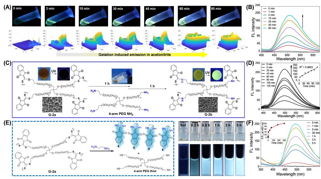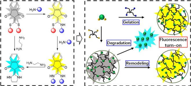 研究成果一开发了一种新的命名为“茚酮烯”的光致发光体,构建光致发光平台,并在可视化跟踪软材料物理化学变化过程方面进行了深入探索。通过硫-胺基团化学交换,可以跟踪量化该共轭受体和胺类化合物之间光学反应的荧光变化。在此基础上,将此类光学反应应用于可视化且量化的水凝胶合成、拓扑转换以及化学触发降解中,均实现了荧光增强的可视化跟踪以及不同水凝胶网络的机械性能转变。同时提供了数字图像处理的荧光分析方法来辅助光学反应的跟踪,在空间和时间尺度上对化学触发的聚合物形成、形态和降解进行实时光学观察和量化,为开发新一代“智能”材料提供可能。