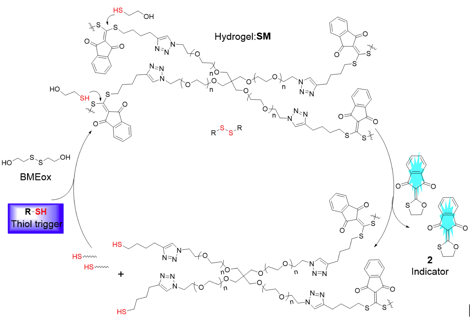 另一项工作开发了单一共轭受体的“茚酮烯”发光体,在水溶液条件下表现出聚集诱导发射的发光性质。该共轭受体与β-巯基乙醇在中性条件下的光化学反应产生了比率吸收和荧光-开启的信号变化。在此基础上,通过CuAAC点击反应合成了含有非发光共轭受体连接体的聚乙二醇水凝胶,然后与2-羟乙基二硫化物协同作用,形成可由硫醇触发的自循环级联反应系统,实现荧光信号扩增和大分子材料降解的双重信号响应。而在没有2-羟乙基二硫化物或仅有硫醇引发剂的对照实验中,光学信号几乎无变化。重要的是,GSH作为一种关键的细胞内生物硫醇分析物,也能够通过跟踪聚合降解与信号放大进行检测。使用生物相容性的PEG材料进行传感设计,加上无背景干扰的信号放大,可用于开发具有高灵敏度和选择性的生物传感器,特别是应用在早期诊断检测方面。化学触发的自循环大分子降解和光学检测代表了新一代有前途的智能刺激响应材料。