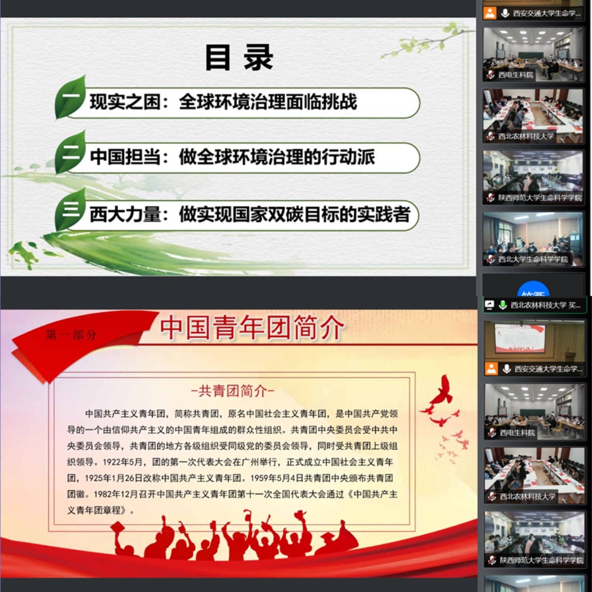 西北大学生命学院团支部书记邓紫月以“携手构建地球生命共同体”为题,剖析全球环境治理面临的现实之困,生动讲述中国治理行动担当与实现国家双碳目标中的西大力量;西安电子科技大学生命学院团支部书记刘雨薇以“青春志愿行·一起向未来”为题,通过一个个鲜活事例展现志愿者的坚守防疫、网络发声传递的温暖力量与逆行者家庭的共克时艰,号召团员们将在党和人民最需要的地方绽放青春绚丽之花;西北农林科技大学团支部书记买热帕提•买买提带领全体团员回溯百年团史,重温峥嵘岁月。她表示团员青年要从历史演进中获取经验智慧、认识发展规律、把握前进方向,让红色基因、革命薪火代代传承志存高远;西安交通大学生命学院团支部书记景彦舒以“忆五四芳华 书青春华章”为题,带领团员回溯1925年至今,西安交通大学共青团走过了九十七年风雨历程。分享交大青年与祖国共进、与时代同行,在祖国各行各业竭诚尽智,耕耘不辍的故事。与会同学反响强烈。