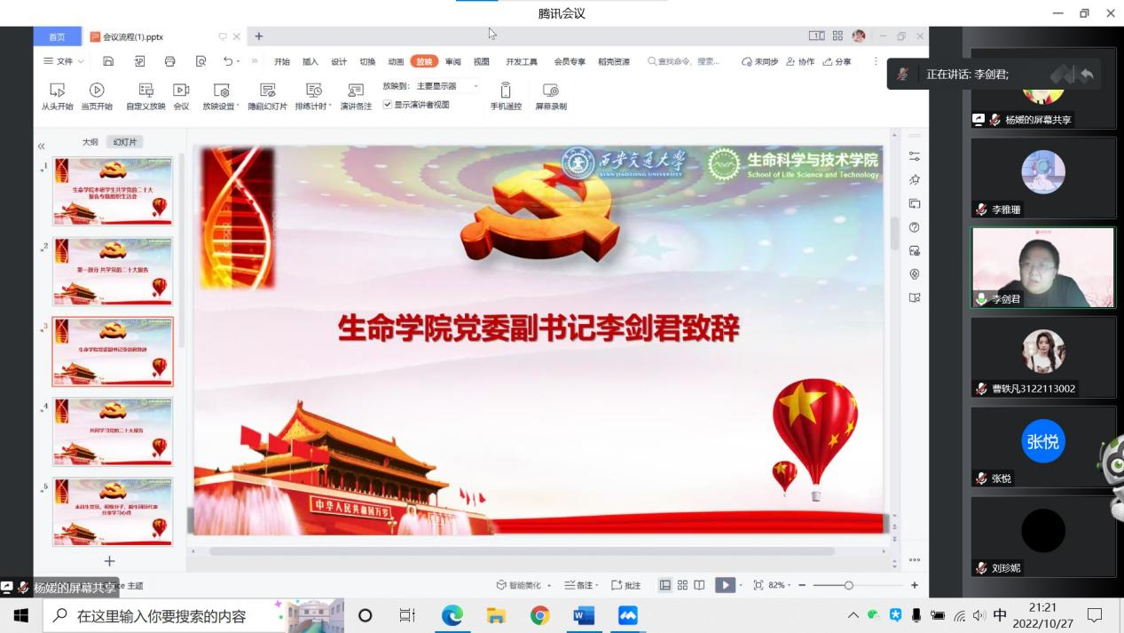 为深入学习领会党的二十大精神,10月27日晚,生命学院组织全体学生通过思源平台收看了马克思主义学院举办的《中国共产党第二十次全国代表大会报告解读》讲座。10月28日晚,生命学院各本科生党支部、团支部联合2022级两个硕士党支部共同举办党的二十大报告线上学习研讨会。生命学院分党委副书记李剑君,励志书院、南洋书院、仲英书院党建辅导员,生命学院(生物医学工程专业)南洋仲英励志师生联合党支部、生命学院(生物技术专业)励志书院师生联合党支部全体师生党员,2022级硕士生第一党支部、第二党支部全体党员,以及本科生团员代表共220人线上参加学习。生命学院分党委组织员杨媛主持会议。