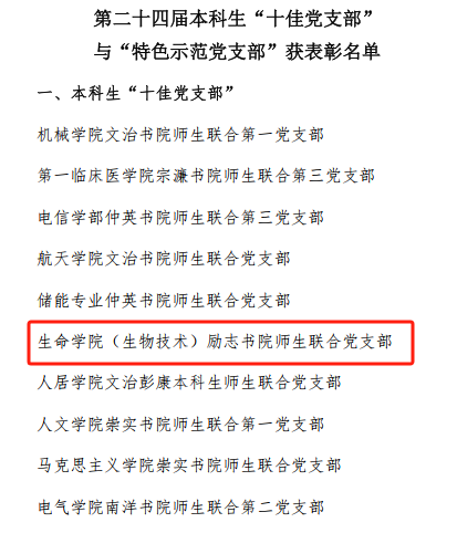 近日,西安交通大学举行第二十四届本科生“十佳党支部”展示交流暨表彰大会。经院校两级评审,生命学院(生物技术)励志书院师生联合党支部始终结合生命学科特色,通过党建引领、双院融合开展工作,立足“七个有力”,从全校数百个本科生党支部中脱颖而出,荣获“十佳党支部”称号!
