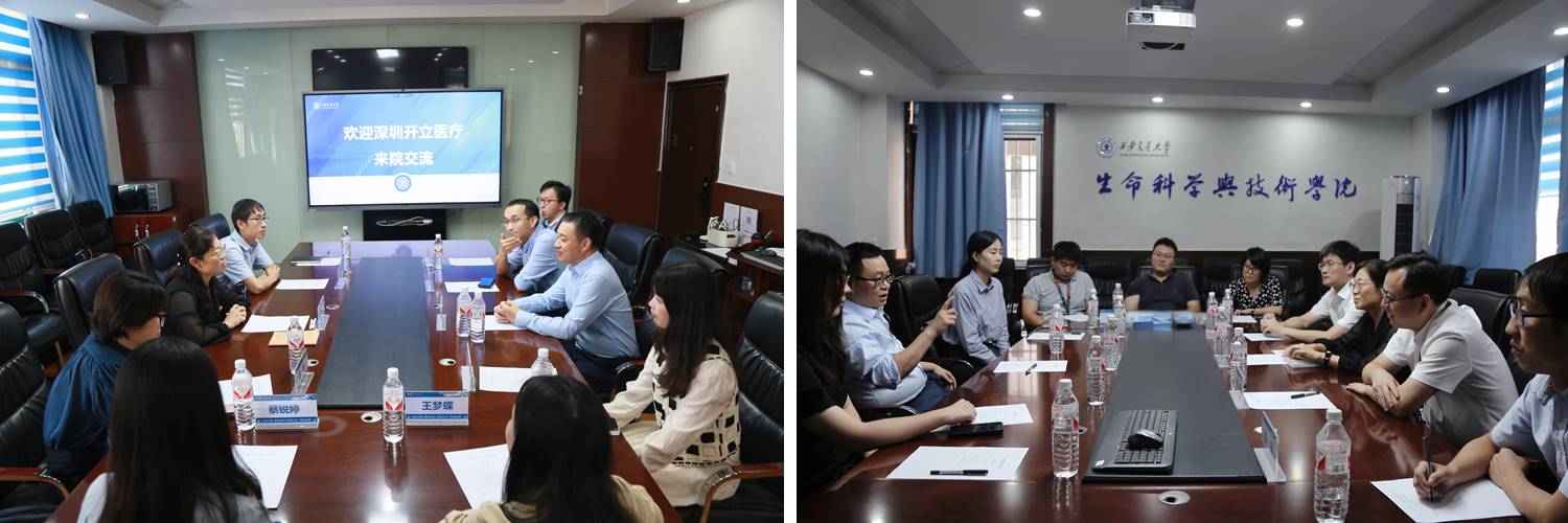 生命学院党委书记刘茹、院长徐峰、副院长杨铁林、院长助理吴亮、生物医学工程系副主任冯怡及教师代表与企业来访人员进行了交流。