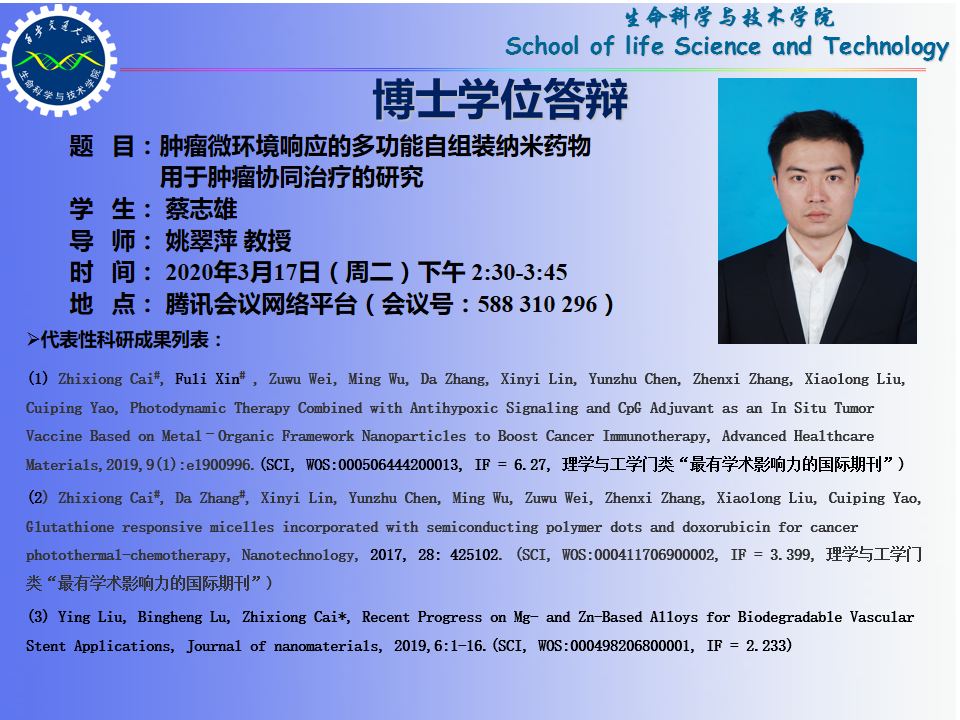 题 目:肿瘤微环境响应的多功能自组装纳米药物用于肿瘤协同治疗的研究