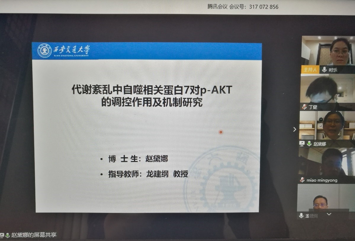 赵黛娜的博士学位论文答辩题目是《代谢紊乱中自噬相关蛋白7对p-AKT的调控作用及机制研究》,她在山西省运城市家中,通过腾讯会议网络平台,进行了学位论文PPT共享,与在美国、加拿大、西安等各地的评委专家进行实时交流。在汇报结束后,答辩委员会专家针对论文内容进行了提问,赵黛娜同学对各位专家所提的问题进行了准确的回答。督导专家对答辩过程进行了发言,表示整场答辩过程交流顺畅,效果良好。