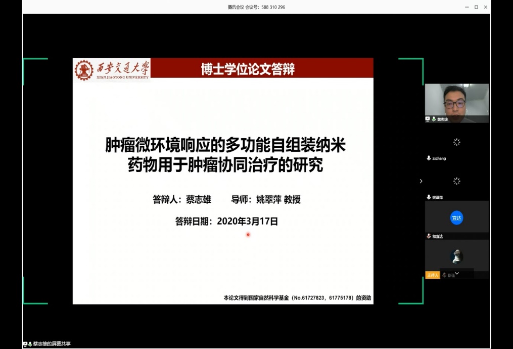 随后蔡志雄同学进行了论文答辩,其博士学位论文答辩题目是《肿瘤微环境响应的多功能自组装纳米药物用于肿瘤协同治疗的研究》,他在福建省福州市家中,通过腾讯会议网络平台,进行了学位论文PPT共享,与在西安、厦门、福州等各地的评委专家进行实时交流。在汇报结束后,答辩委员会专家针对论文内容进行了提问,蔡志雄同学对各位专家所提的问题进行了准确的回答,专家们还就其课题的延伸进行了进一步广泛的讨论。学校督导专家马建刚教授也全程参与了网络答辩过程。
