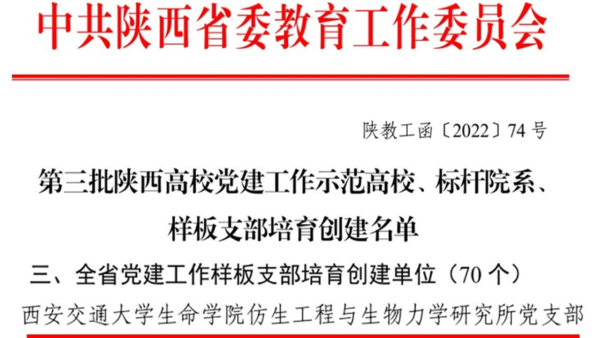 5月18日,在陕西省委教育工委公布的《中共陕西省委教育工委关于公布第三批陕西高校党建工作示范高校、标杆院系、样板支部培育创建名单的通知》中,西安交通大学生命学院仿生工程与生物力学研究所党支部(以下简称生物力学所党支部)入选“陕西省党建工作样板支部”。