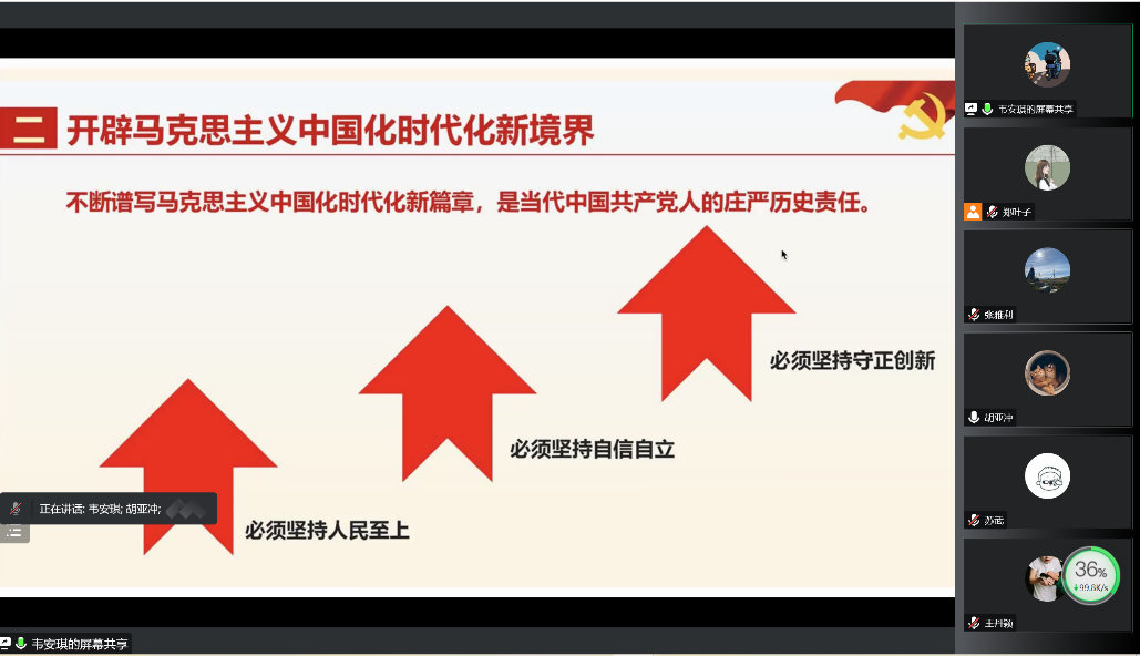 韦安琪同志分享了二十大会议的要点解读,他表示,作为博士研究生,我们要面向国家重大需求,敢想敢干,要坚定不移听党话、跟党走,怀抱梦想又脚踏实地,敢想敢为又善作善成,立志做有理想、敢担当、能吃苦、肯奋斗的新时代好青年,让青春在全面建设社会主义现代化国家的火热实践中绽放绚丽之花。