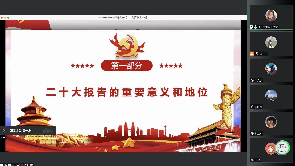 王一方同志重点分享了二十大报告的重要意义和地位。她表示这次报告意义是深远的,表达了聚焦、自信和定力,党的二十大报告进一步指明了党和国家事业的前进方向,是我们党团结带领全国各族人民在新时代新征程坚持和发展中国特色社会主义的政治宣言和行动纲领。