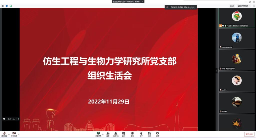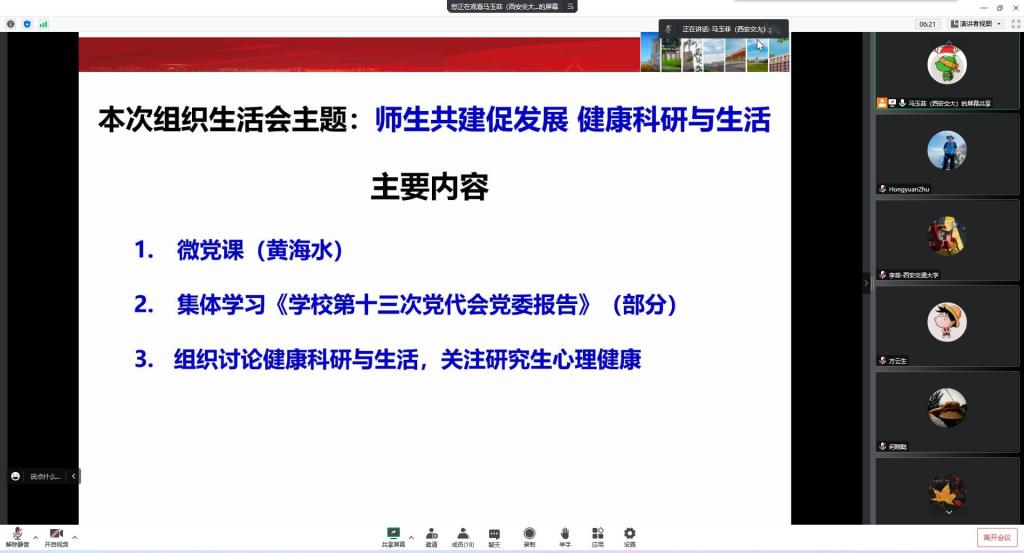 12月1日,仿生工程与生物力学研究所教工党支部线上开展“师生共建促发展 健康科研与生活”主题党日活动,组织生活由支部组织委员马玉菲老师和党支部书记李菲共同主持。