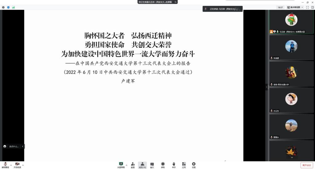之后,全体教工党员集体学习了卢建军书记在交大第十三次党代会上的报告。报告要求坚持党管改革发展,全面提升办学质量和水平,分别从“引培并举、创新机制”,“强化基础、突破前沿”,“产教融合、协同育人”,“顶天立地、强化组织”,“优化布局、交叉融合”,“全球视野、扩大开放”,“思想引领、人文关怀”,“深化改革、守正创新”等八个方面做了详细的论述,指引着我们所科研、教学、人才引进等工作的开展。