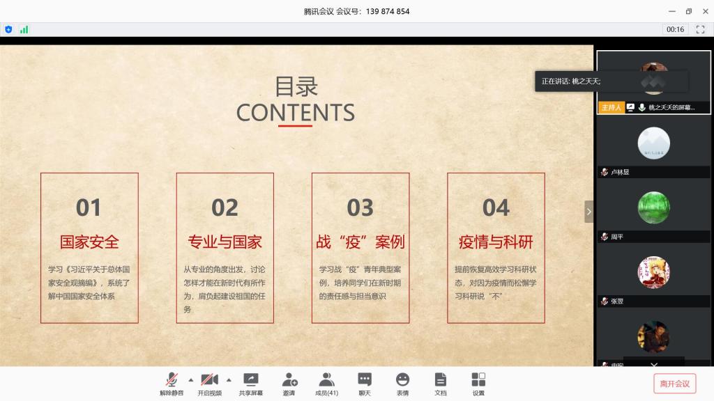 为树立团员青年的安全意识,增强国家安全责任感,在新冠肺炎疫情大背景下,让青年学生深刻认识到国家安全的重要性,生命学院各团支部召开国家安全教育主题班会。通过此次会议,在全体学生心中树立了全方位的国家安全观,让即将参与社会建设的新一代青年人深刻理解“安而不忘危,存而不忘亡,治而不忘乱”的意义。疫情期间,学院安排多次线上学风建设讨论与学习生活情况交流活动,促进学生们提升改进疫情期间的学习科研状态。在做好返校准备工作的同时,积极引导学生形成良好的返校氛围。