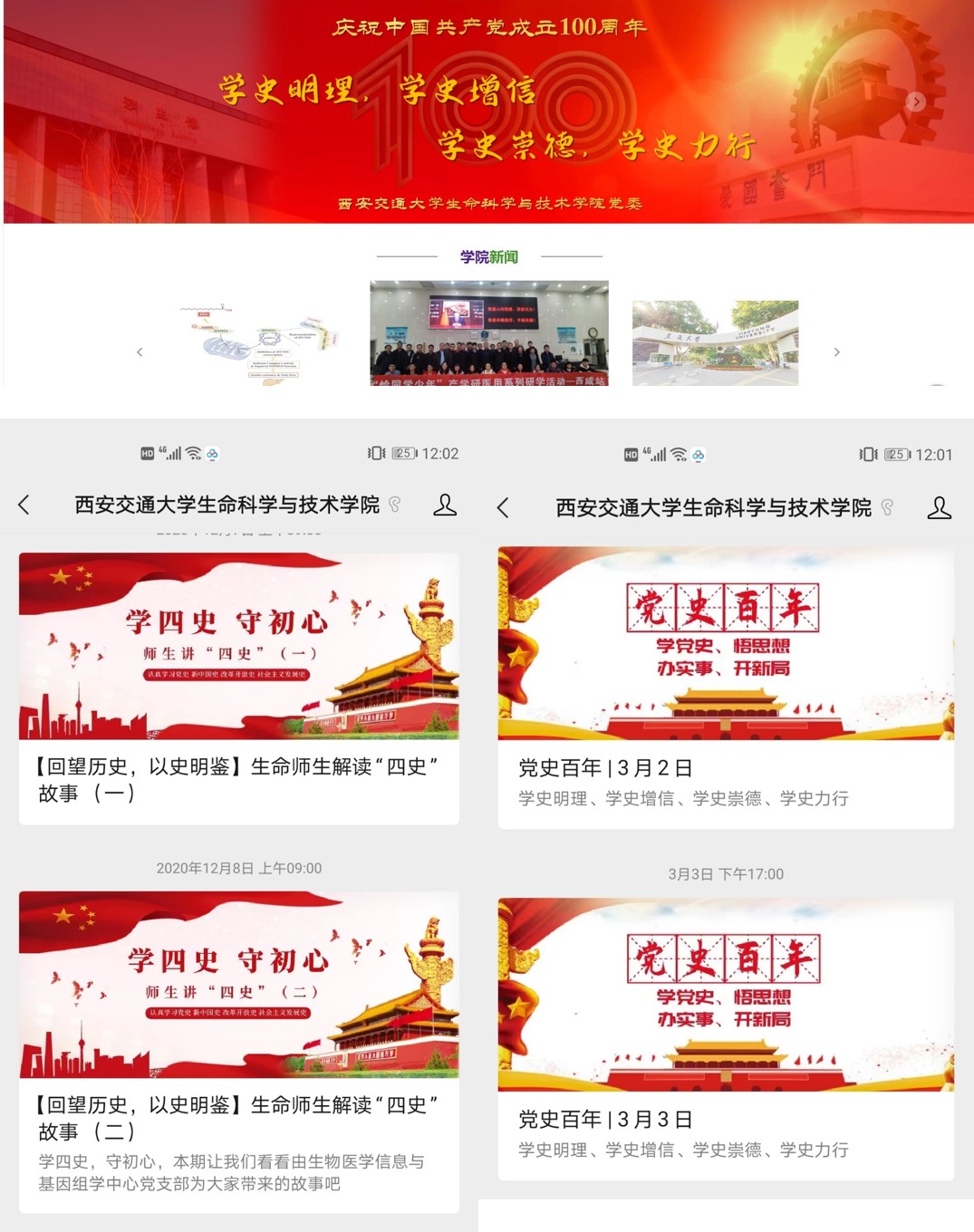 学院充分利用学院网站、新媒体等平台载体,设置党史学习教育宣传页面,开设“师生党员讲四史”、“今日四史”专栏,师生党员积极踊跃分享党史故事,抒发爱党情怀。