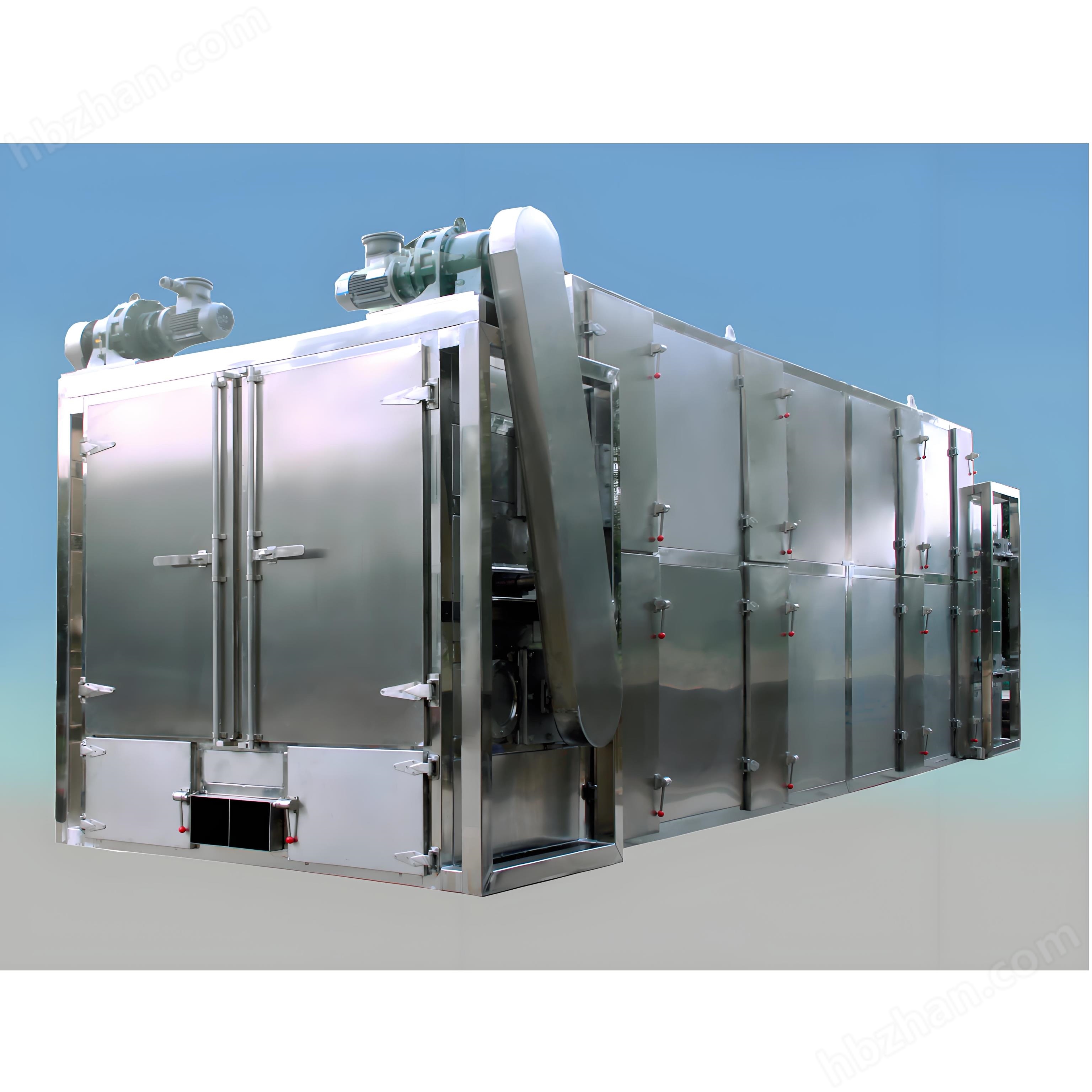 物料由加料器均匀地铺在网带上,网带一般采用12-60目不锈钢丝网,由传动装置拖动在干燥机内移动。干燥机由若干单元组成,每一单元热风独立循环,部分尾气由专门排湿风机排出,废气由调节阀控制,热气由下往上或由上往下穿过铺满物料的网带完成热量与质量传递的进程,带走物料水份。网带缓慢移动,运行速度可根据物料温度自由调节,干燥后的成品连续落入收料器中。上下循环单元根据用户需要可灵活配备,单元数量亦可根据需要选取。