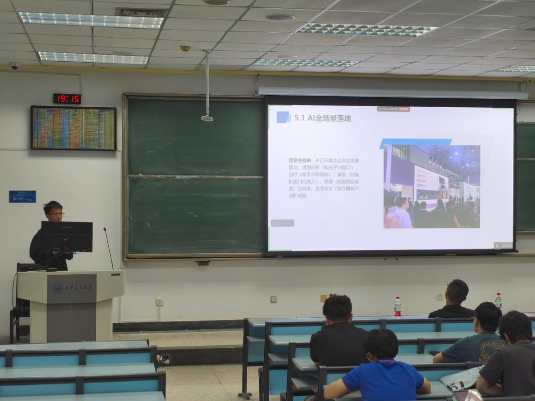 研究生专场则呈现出更深入的技术分析和产业思考。袁润同学在《国产医疗器械的崛起之路》中,以迈瑞全光纤体征监测仪、联影光子计数CT等突破性产品为例,揭示了国产器械从“跟跑”到“领跑”的艰辛历程,并指出核心部件自主化与AI安全性评估等关键挑战。黄治隆同学围绕《医疗影像的自主创新路径》,分析了全球市场格局,展示了联影“元智”大模型的影像诊断应用及东软双宽体CT、迈瑞无液氦磁共振等硬件创新,强调“产学研医”协同对转化至关重要。王博韬同学描绘了《脑机接口的产业化图景》,对比侵入式与非侵入式技术,分享了脑虎科技临床进展与强脑科技消费产品,展望“脑机接口+AI”在神经疾病治疗中的巨大潜力。霍平平同学以《智能驱动与交叉赋能》为题,聚焦联影AI导航CT、迈瑞全链路影像传输等技术,表示智能化与精准化是行业核心引擎,作为青年学子要立足临床痛点推动创新。