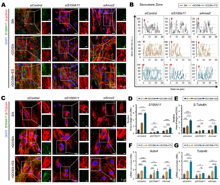 值得注意的是,研究团队还发现S100A11的表达并不局限于细胞质,其在细胞核中的表达受到电学微环境的调控。通过三维共聚焦显微分析发现,在Silk中,细胞核内S100A11表达极低;而在rGO/Silk组,尤其是rGO/Silk+ES组中,S100A11核内表达明显增强。敲低S100a11或Anxa2基因均显著抑制了S100A11的核转位,表明该过程依赖于S100A11/ANXA2复合体的形成。ANXA2本身定位于细胞质且不入核,提示其可能在S100A11穿越核膜过程中起辅助作用。进一步研究表明,在rGO/Silk和rGO/Silk+ES条件下,Gata4和Zfpm1的mRNA水平显著上调;而沉默S100a11或Anxa2则下调其表达,且电刺激只可部分恢复。这些结果提示,电信号诱导使得S100A11在ANXA2协助下核转位,从而上调Gata4和Zfpm1转录,可能会进一步促进心肌结构与功能相关基因的表达(图5)。