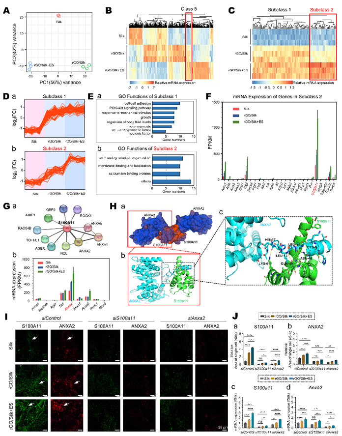为进一步分析外部电学微环境对ETC细胞的电生理和成熟的调控,团队对NRCMs在Silk、rGO/Silk及rGO/Silk+ES条件下的全基因组转录变化进行了分析。结果显示,rGO/Silk及rGO/Silk+ES显著上调了一类与钙离子结合、膜功能及细胞骨架相关的基因,提示其提示其在电学信号转导中有关键作用。FPKM分析显示其中S100a11表达最高,且被导电材料显著上调,电刺激进一步协同增强其表达。结构建模提示S100A11与ANXA2通过非共价相互作用形成异源四聚体。siRNA沉默实验进一步显示,敲低任一基因均显著削弱细胞对电信号的响应及共定位系数,表明S100A11与ANXA2互作且形成稳定复合体(图2)。