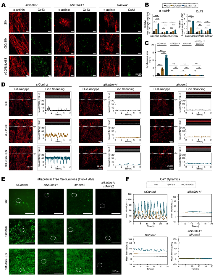 通过基因功能沉默实验,研究探讨了S100A11/ANXA2复合体是否介导ECT的电转导并调控E−C耦联,分析了骨架蛋白(β-Tubulin)、收缩蛋白(α-actinin、Cx43)、肌节结构、IMP、CICR及细胞内游离Ca²⁺水平。结果显示,rGO/Silk及rGO/Silk+ES显著上调了α-actinin、Cx43和β-Tubulin的表达,优化了肌节排列与细胞骨架结构;这可能提高收缩蛋白对Ca²⁺的敏感性与肌节收缩力。单独沉默S100a11或Anxa2会引起上述蛋白表达下降、肌节结构被破坏,这种结构丧失在同步沉默的细胞中更加显著。电生理功能显示,IMP与钙水平分析表明单独沉默S100a11或Anxa2均显著降低IMP与CICR的幅值与频率,同步沉默则导致IMP与CICR信号几乎完全消失,游离Ca²⁺水平进一步降低;同步缺失S100a11和Anxa2的细胞几乎完全丧失Ca²⁺瞬变与自发收缩能力,且该损伤无法被电刺激所逆转。单独沉默S100a11比Anxa2的作用更加显著。结构建模显示,S100A11/ANXA2复合体稳定结合Ca²⁺。这些结果提示,S100A11/ANXA2复合体是ECT响应电学微环境并参与调控心肌搏动功能的核心分子,通过协调Ca²⁺内流、CICR与细胞骨架重构,显著增强E−C耦联及整体心肌功能;并且S100A11可能在复合体中起主导作用(图3–4)。